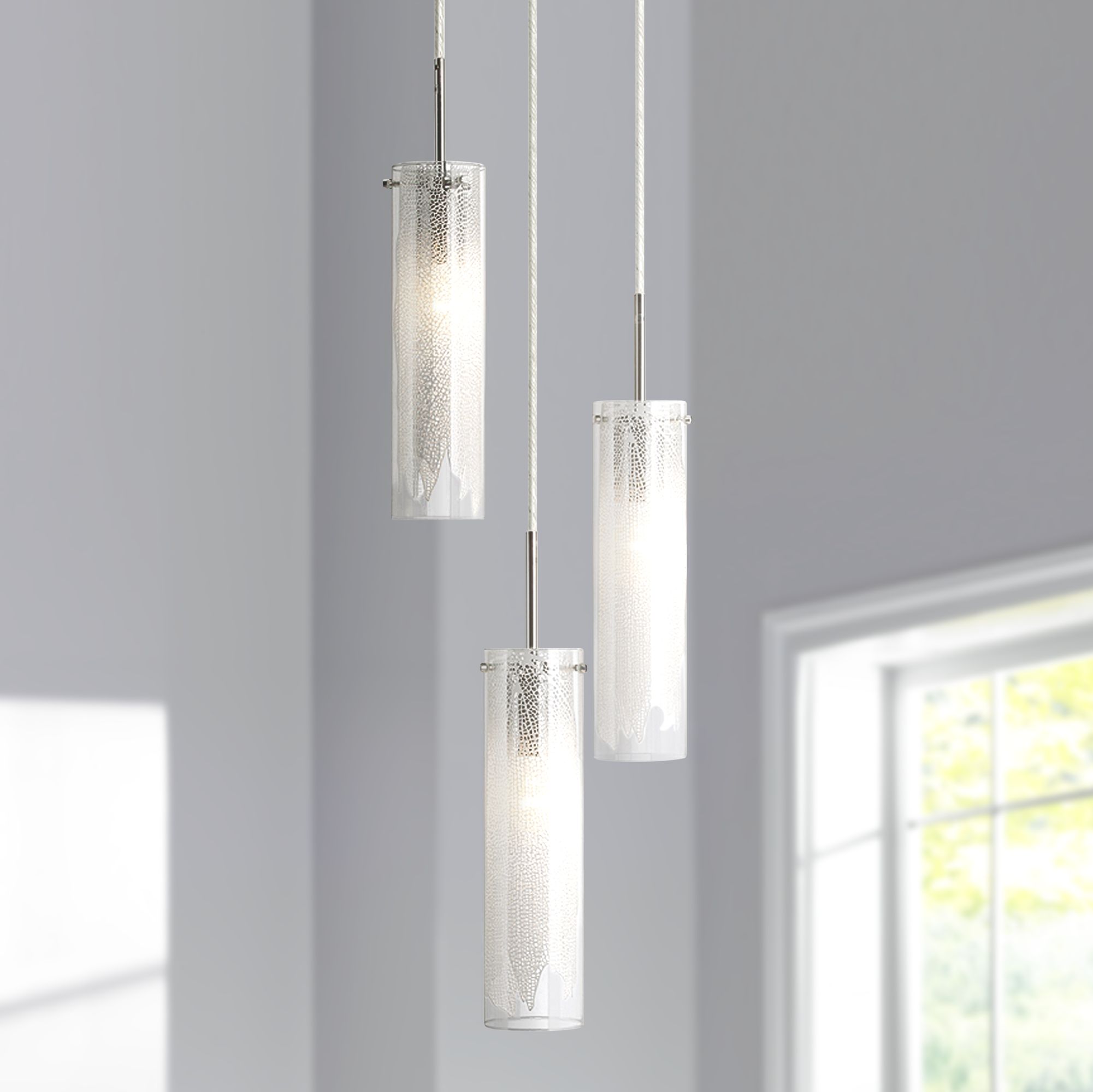 This cluster pendant light fixture features a modern design that adds an industrial look to any setting. These fixtures have a group of pendant fixtures attached to a single canopy that is suspended from the ceiling. This multi light chandelier offers a brushed nickel finish exposed hardware and clear glass shades.